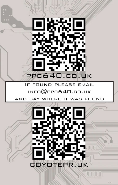 With the RFID card tested with basic software, it's now time to turn and look at what to do with the actual RFID cards themselves. What to do with them as plain white with a sticker on them doesn't look good. Designing the cardsWhat to put on the cards and what should they look like was a question to ponder over. Then after a prolonged case of procrastination, an idea was formed & Illustrator was opened and designing started. The other thing that came together was the name of the new machine. It was in keeping with the original PPC range (the 512 & 640) that was named after how many kilobytes of RAM the machine had. In this case it's how many Megabytes! The FrontThis has a nod to the original design & colour scheme of the, original, PPC640. It will probably have a slight redesign when the "empty area" at the bottom will be filled with something appropriate